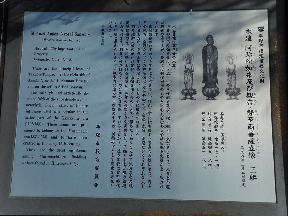 本尊の阿弥陀如来・観音菩薩・勢至菩薩の3体の立像は、平塚市指定重要文化財になっています。